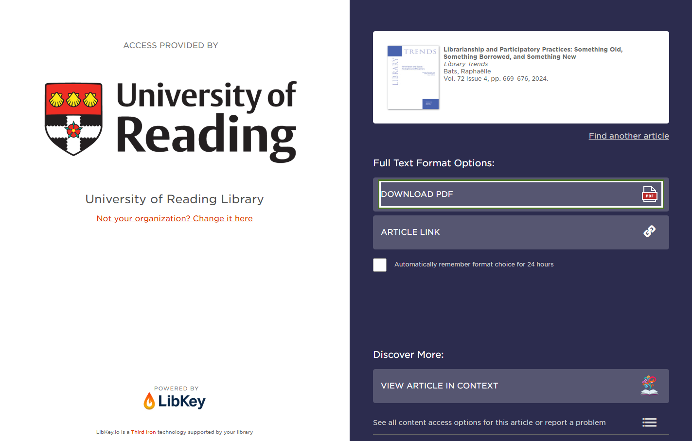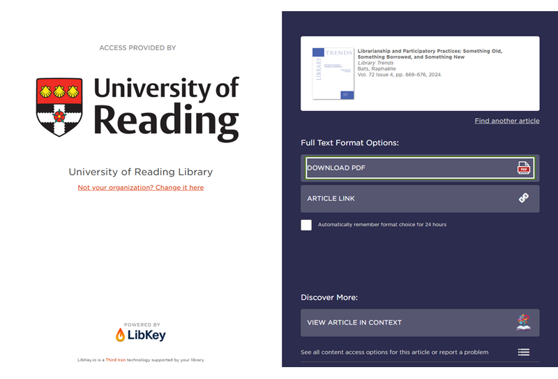If we have access, you will be taken directly to the source via the LibKey Link screen which gives you a choice of formats (PDF download, a link to read the article in your web browser or view the article alongside other articles from the same journal issue.) You may need to login with your University username and password to access the item.